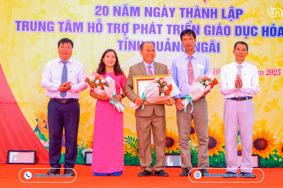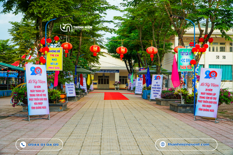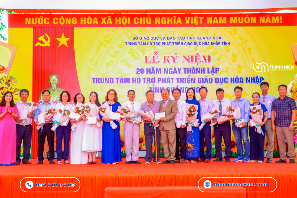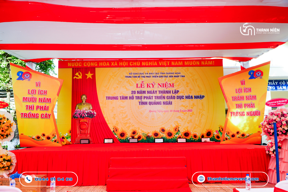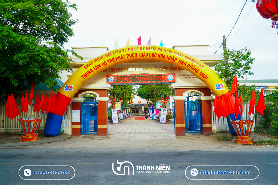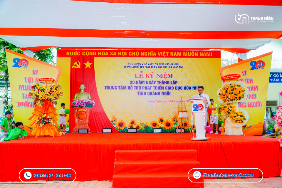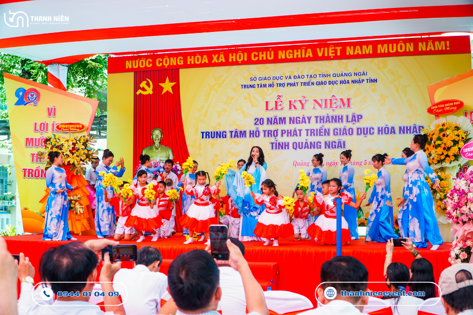 Vừa qua, Trung tâm Hỗ trợ Phát triển Giáo dục Hòa nhập tỉnh Quảng Ngãi đã long trọng tổ chức Lễ kỷ niệm 20 năm ngày thành lập. Tự hào là đơn vị được tin tưởng bàn giao trọng trách thiết kế, in ấn và thi công sự kiện tại Quảng Ngãi trọn gói, Thanh Niên Event đã nỗ lực kiến tạo nên một không gian lễ hội trang trọng và chuyên nghiệp. Hành trình 20 năm không chỉ là những con số, mà là cả một chặng đường thắp sáng niềm tin cho những mảnh đời đặc biệt. Bài viết này sẽ đưa ra một số hình ảnh đầy nhân văn của dự án.