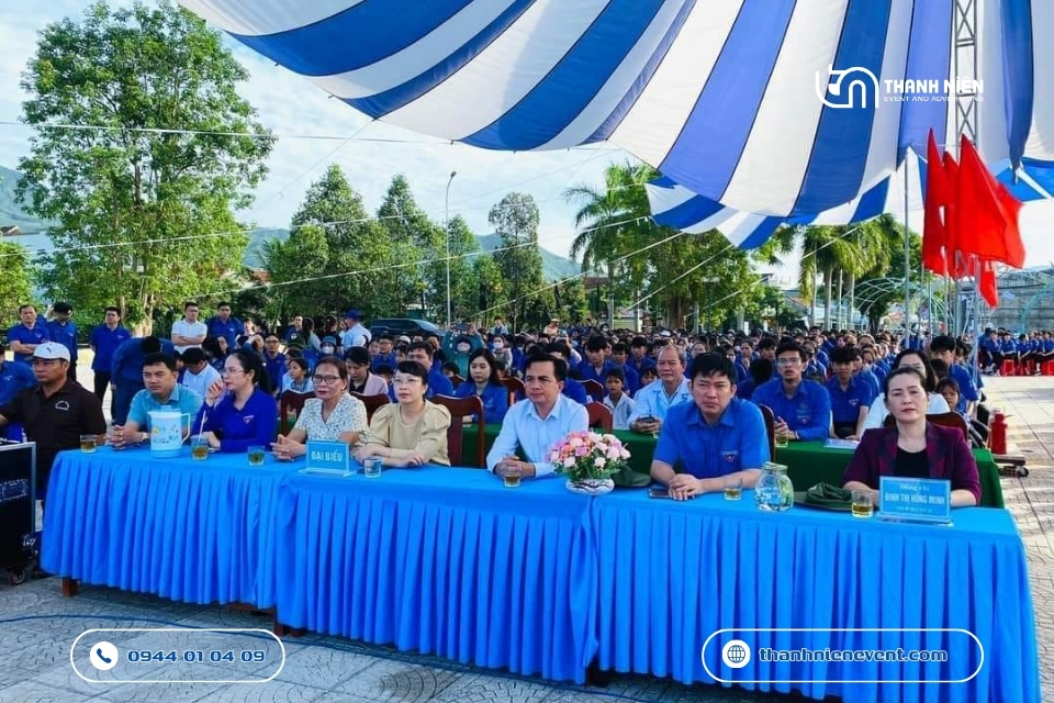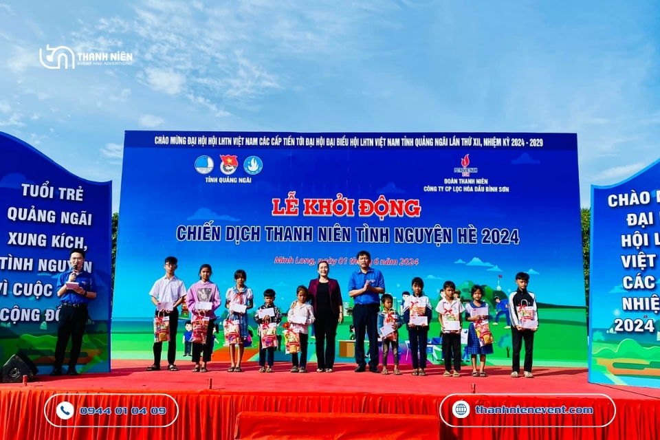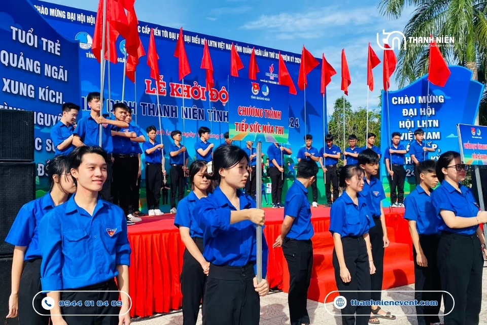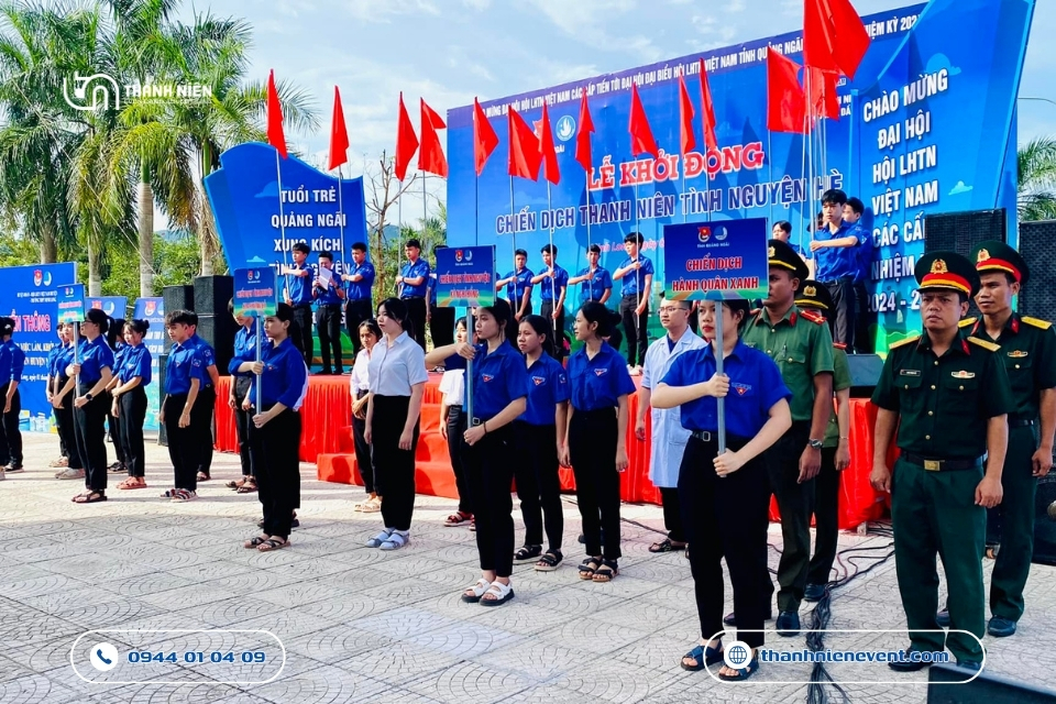 - Nghi thức khởi động đầy sáng tạo: Điểm nhấn quan trọng nhất của sự kiện chính là nghi thức lễ khởi động. Thanh Niên Event đã lên ý tưởng cho phần bấm nút hoặc phất cờ lệnh ra quân đầy khí thế. Tiếng trống giục giã kết hợp cùng hiệu ứng pháo kim tuyến và âm nhạc hào hùng đã tạo nên khoảnh khắc bùng nổ, tiếp thêm động lực cho hàng nghìn tình nguyện viên sẵn sàng lên đường về với những vùng khó khăn.