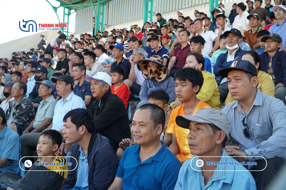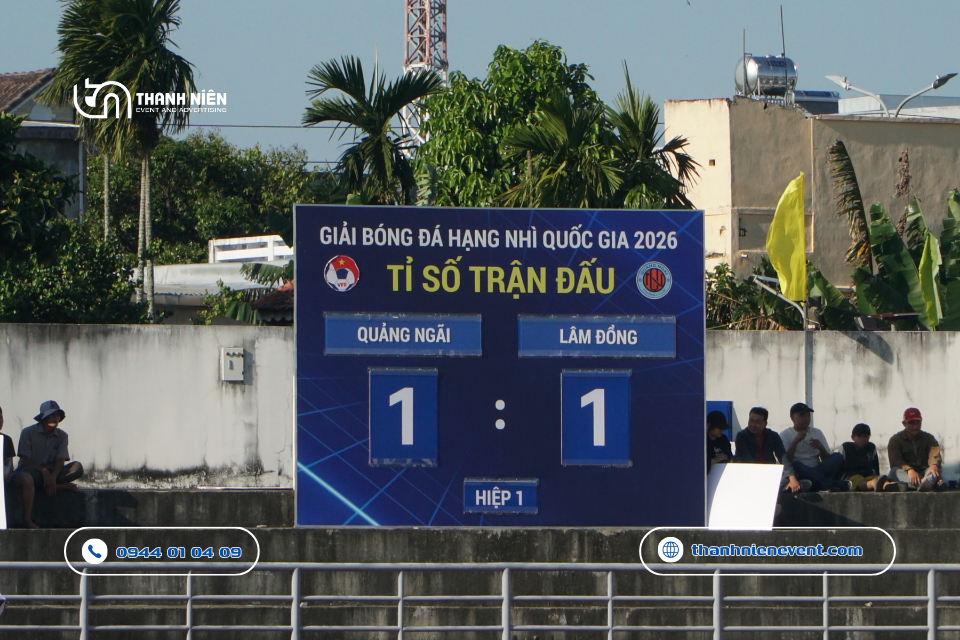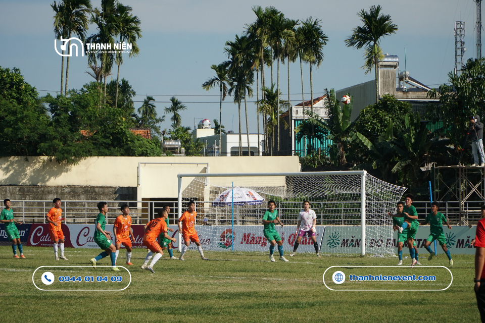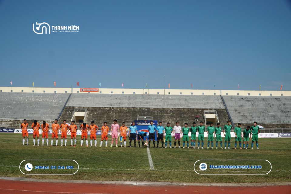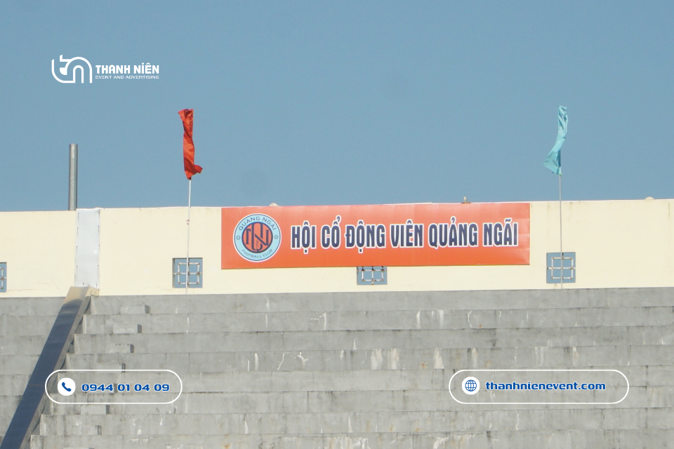 - Độ bền chất liệu: Các hạng mục quảng cáo phải chịu được nắng gắt và gió mạnh của Quảng Ngãi. Để làm được điều đó, Thanh Niên sử dụng bạt hiflex đế xám cao cấp và decal chống nắng để đảm bảo màu sắc luôn tươi mới suốt giải đấu.