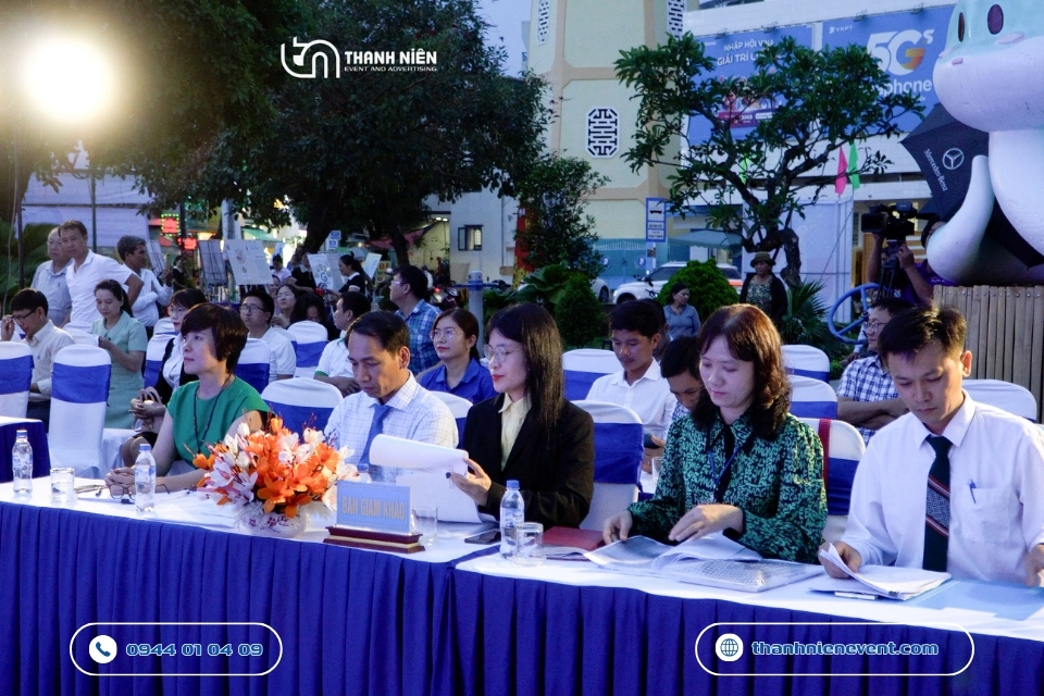 - Bàn ghế sự kiện: Bố trí khoa học cho hội đồng giám khảo và khách mời với khăn phủ chỉn chu, chuyên nghiệp.