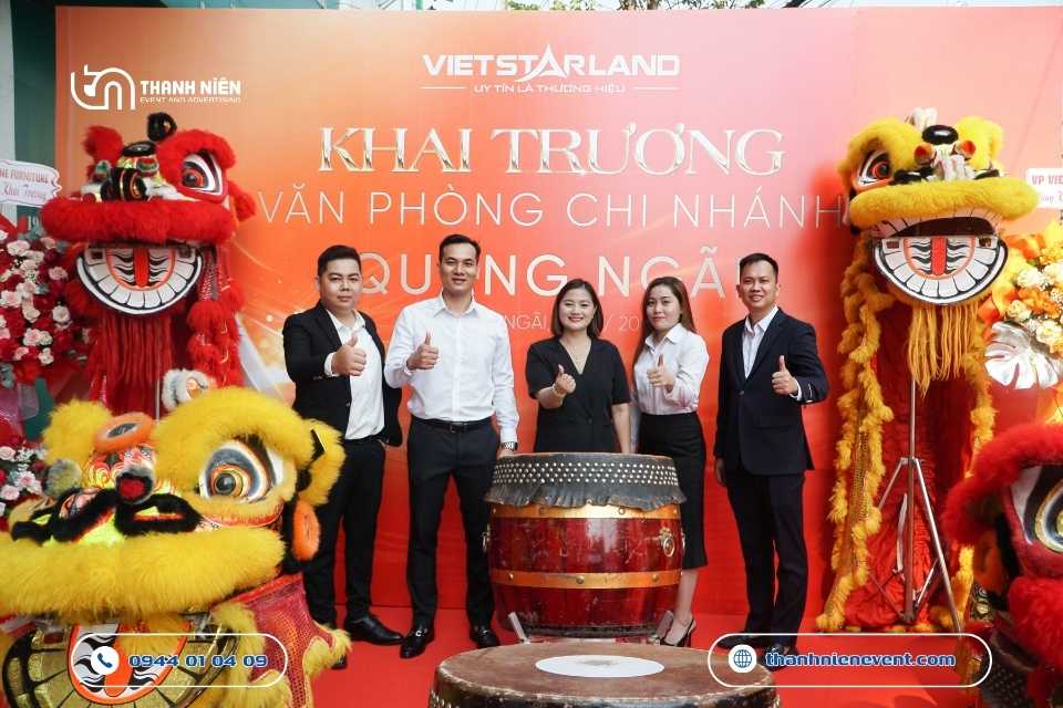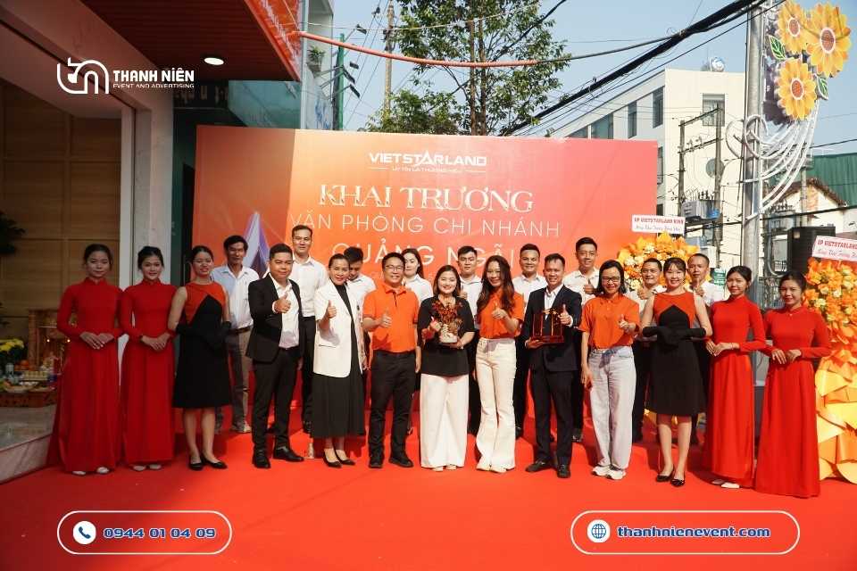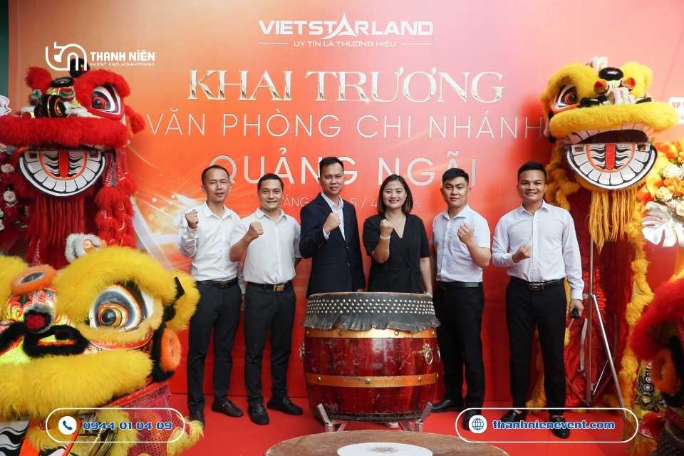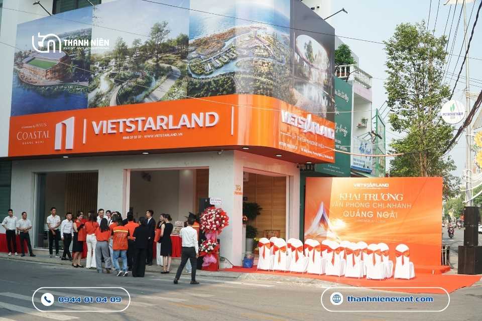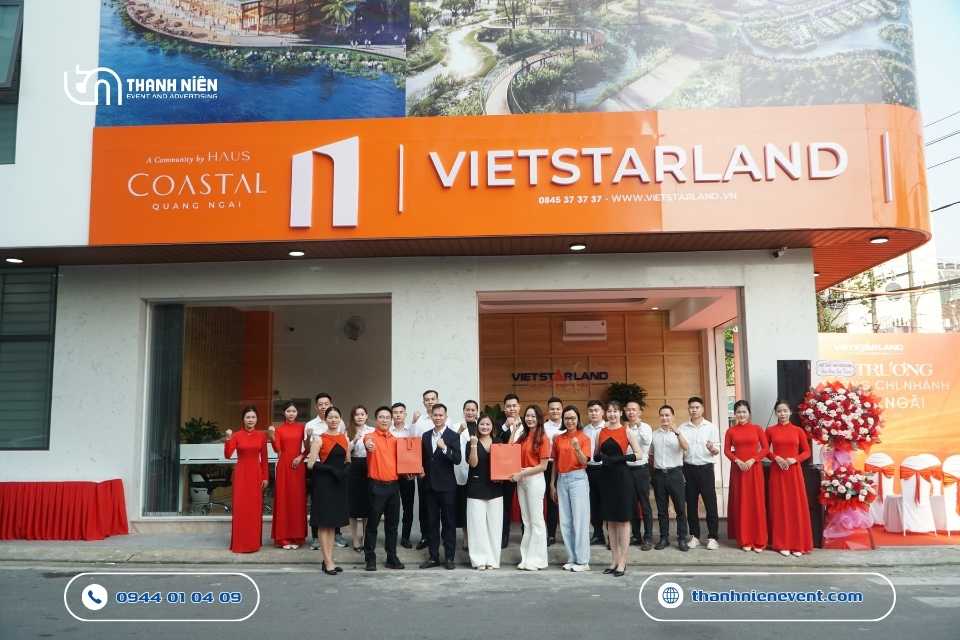 Thanh Niên Event tự hào là đơn vị đồng hành thực hiện dịch vụ tổ chức sự kiện khai trương trọn gói cho chi nhánh Vietstarland tại Quảng Ngãi. Với sự chỉn chu trong từng hạng mục từ khâu chuẩn bị đến thực thi, chúng tôi đã mang đến một không gian sự kiện sang trọng, đánh dấu bước tiến chiến lược của Vietstarland tại thị trường miền Trung.