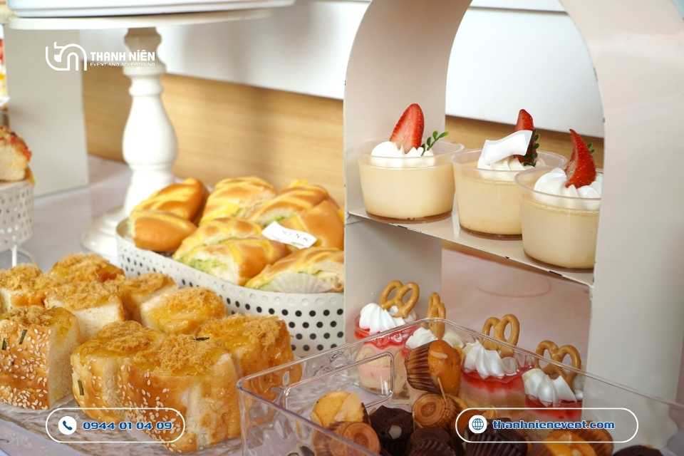 - Tiệc trà Teabreak tinh tế: Chúng tôi chuẩn bị menu tiệc trà với trái cây tươi và bánh ngọt, tạo không gian giao lưu thoải mái cho khách mời.